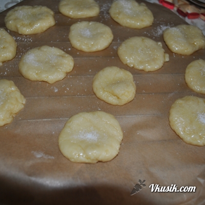 Я готовлю в аэрогриле, поэтому обтянем нижнюю и среднюю решётку пекарской бумагой, тоже самое можно делать и с противнем. Выкладываем печеньки, протыкаем каждую зубочисткой в нескольких местах, чтобы они не поднимались и присыпаем сверху сахаром