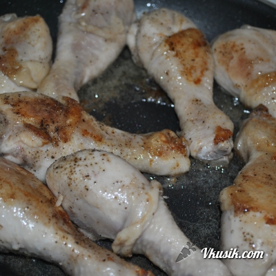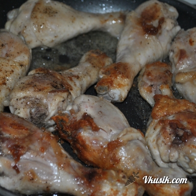 Выложить голени на сковороду обязательно с раскаленным маслом, ( в противном случае курочка будет прилипать и вся останется прилипшей к сковороде, и будет просто лысой, и потом еще сковородку замучаетесь отмывать)