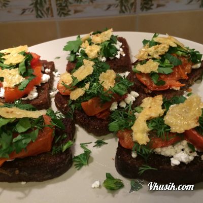 И сверху ломаем сыр, посыпаем каждый бутерброд сырными чипсами, сбрызгиваем бальзамическим уксусом!