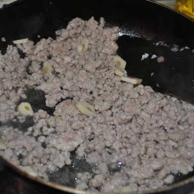 Для начала обжарим фарш до полуготовности с разрезанным вдоль чесночком - на оливковом масле.