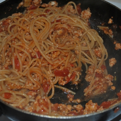 Когда спагетти будут готовы, сливаем воду и все спагетти отправляем в сковородку к фаршу с соусом и помидорами, перемешиваем и еще немного тушим ( минуты 2-3). Солим по вкусу.