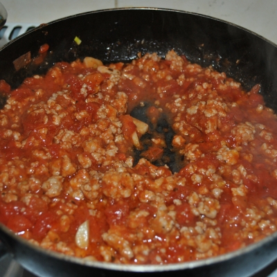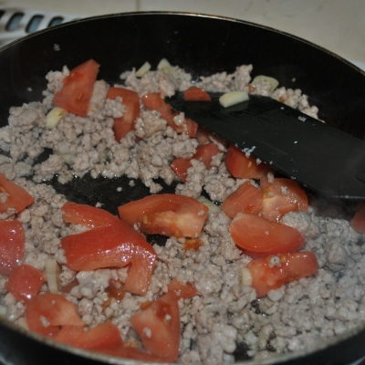 Пока отвариваются спагетти, добавляем в фарш помидоры и продолжаем тушить его на небольшом огне.