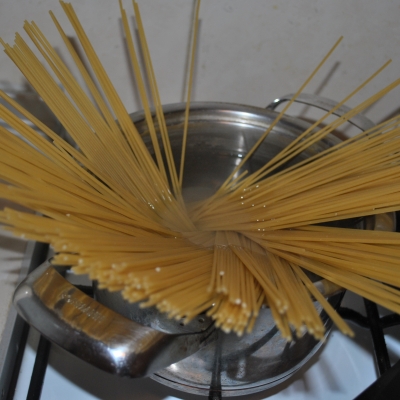 Параллельно отвариваем спагетти в чуть подсоленной воде. Спагетти не должны быть переваренными, а лучше слегка-слегка твердоватыми.