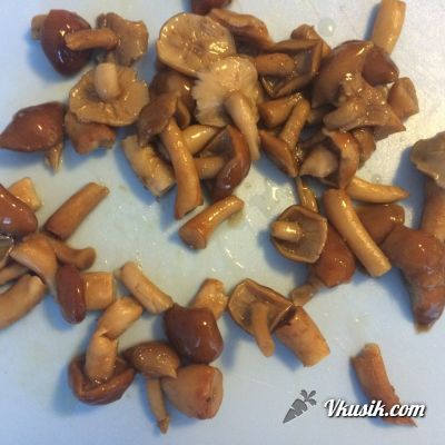 Опята отвариваем в чуть подсоленной воде и тоже отправляем в сковороду