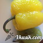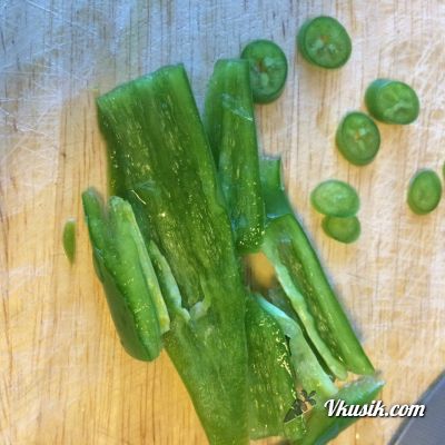 Перчик Чили разрезаем - вытаскиваем все семечки, нарезаем на палочки и тоже отправляем в сковорду